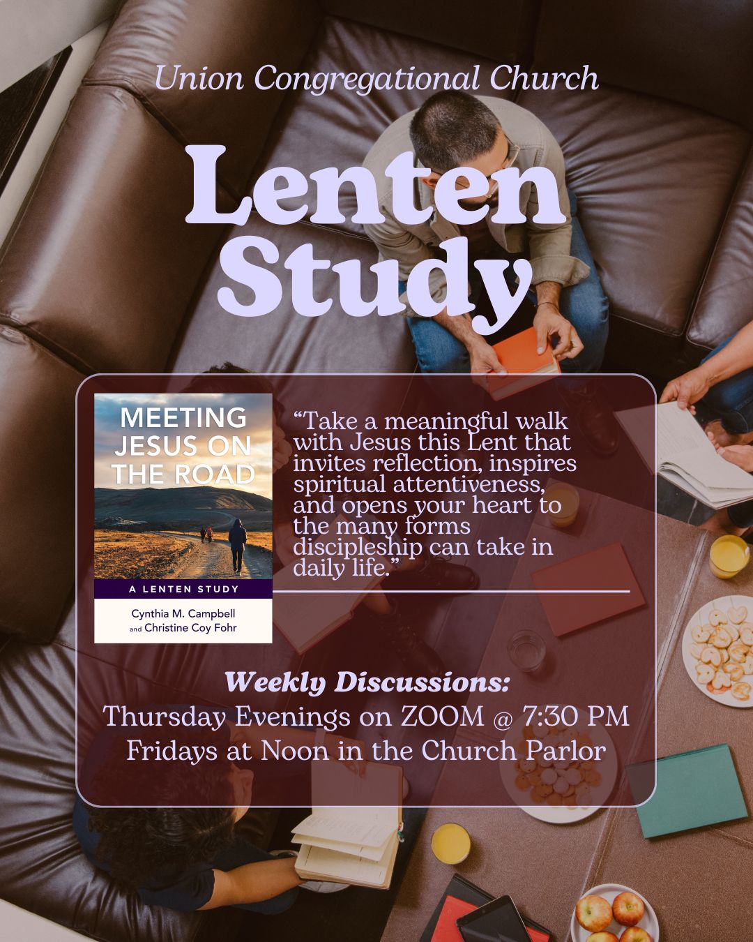 You are invited to share in study and discussion together this Lent by Meeting Jesus On the Road. Each week, we’ll discuss a chapter from the book (starting this week with the introduction and first chapter). Those who would like a copy of the book should contact Pastor Shepherd. There are two meeting times: in person in the Parlor at Church on Fridays from 12:00-1:00 PM, and Thursday evenings from 7:30-8:30 PM on Zoom (to add the Zoom meeting event to your calendar, click here).